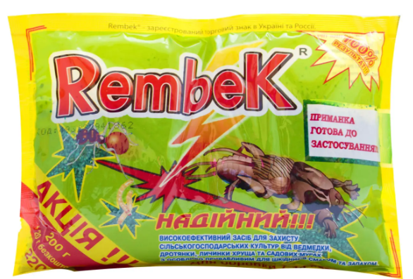 Представляємо препарат «Рембек», дія якого спрямована на знищення всіх перерахованих вище шкідників. Це отруйна приманка хімічного походження, готова до застосування після розкриття пакета. Препарат «Рембек» 220 г відгуки як інсектицид має задовільні, розрахований на оброблення 7-10 соток городу. 0,5 год. л. приманки розміщують у нірки ведмедки або дротянки, після чого вхід закривають. Захисна дія препарату триває 14 днів.